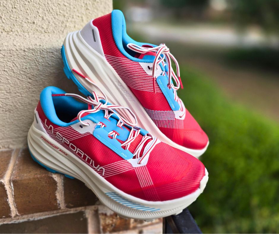 La Sportiva Prodigio Max (Women’s – Hibiscus/Malibu Blue): A dream shoe for long miles on rugged terrain, the La Sportiva Prodigio Max delivers a lightweight feel with max cushion—without the overly squishy ride. Designed for ultra distances but great for any run thanks to the wide toe box, Trail Rocker™ sole geometry, and durable 3.0 FriXion® Red outsole lugs that grip without feeling clunky. Important sizing tip: La Sportiva runs small—go a full size up from your everyday shoes (or a half size bigger than your normal running shoe. Watch my video review HERE!