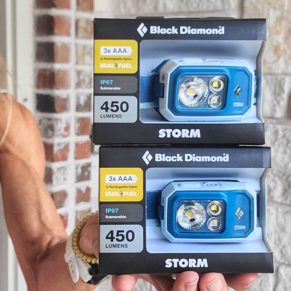 Black Diamond Storm 450 Headlamp: The Storm 450 is a trail-runner and hiker favorite for a reason—450 lumens, long-distance beam, and multiple lighting modes (strength, dim, strobe, plus red/green/blue night vision). Rated IP67 waterproof/dustproof, it thrives in rain, snow, and rugged conditions. Runs on 3 AAA batteries (included) but also compatible with BD’s rechargeable battery. Low-profile, no-bounce, and adventure-ready. I like that it’s bright enough that I can run behind my husband and not even have to turn mine on!